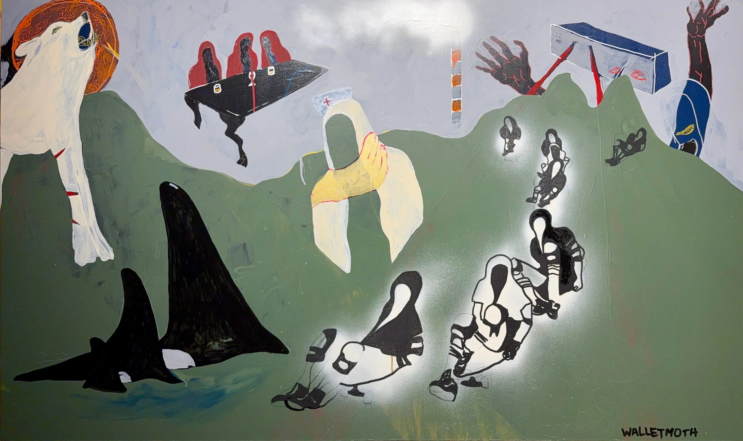 “An Argument Surrounded by Water” multi=panel painting 2024, mixed media on canvas.